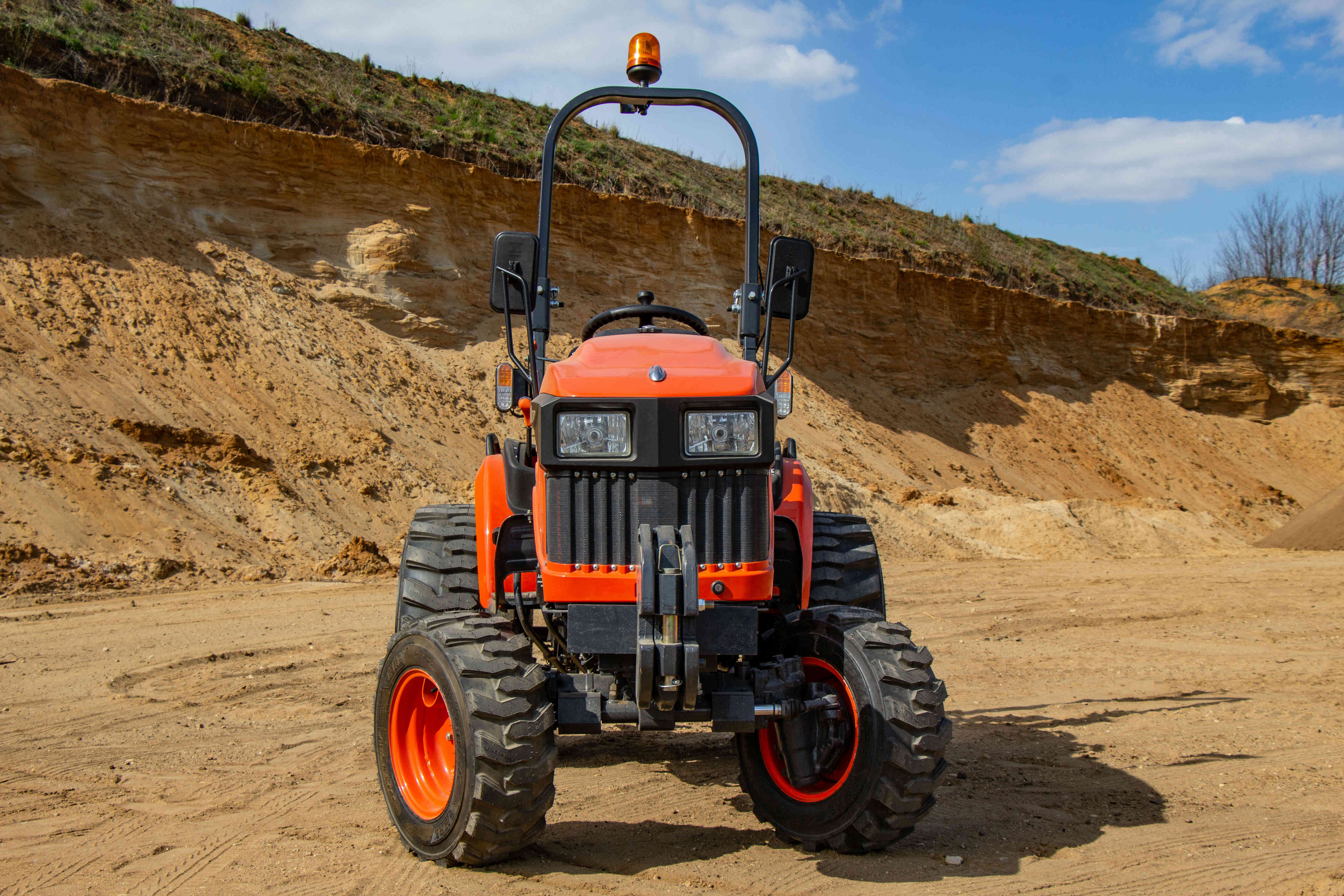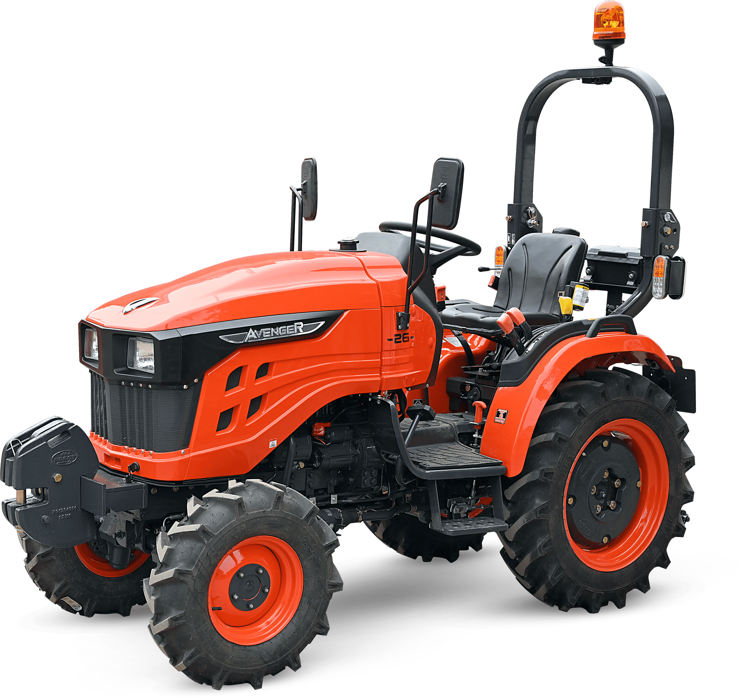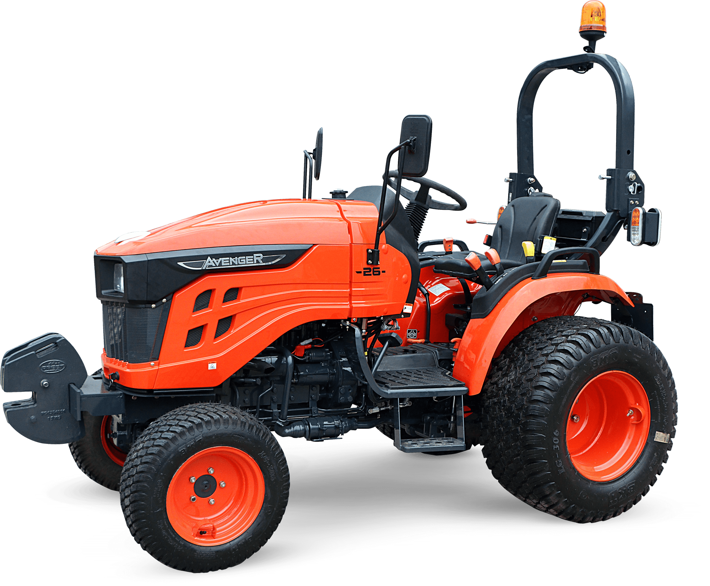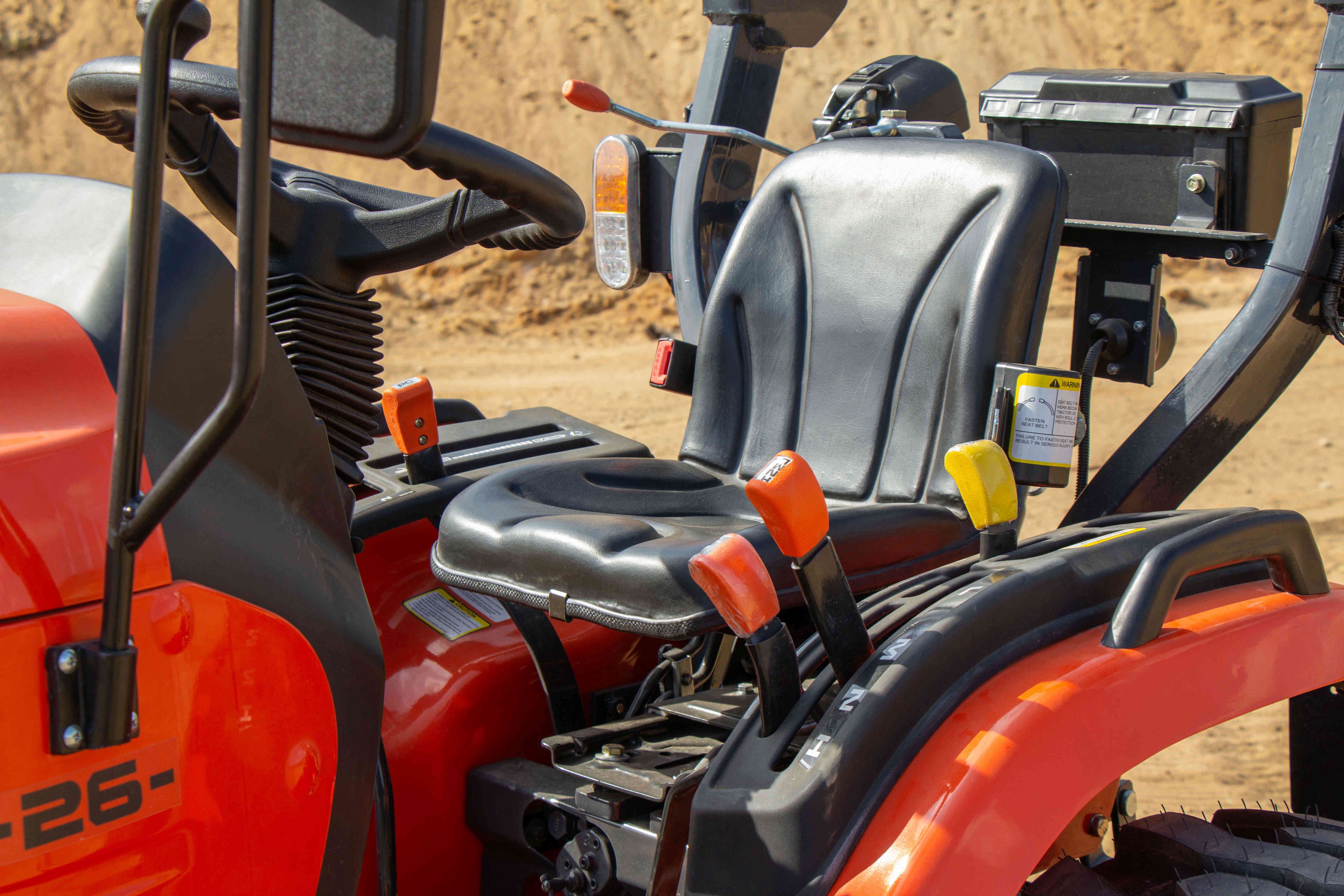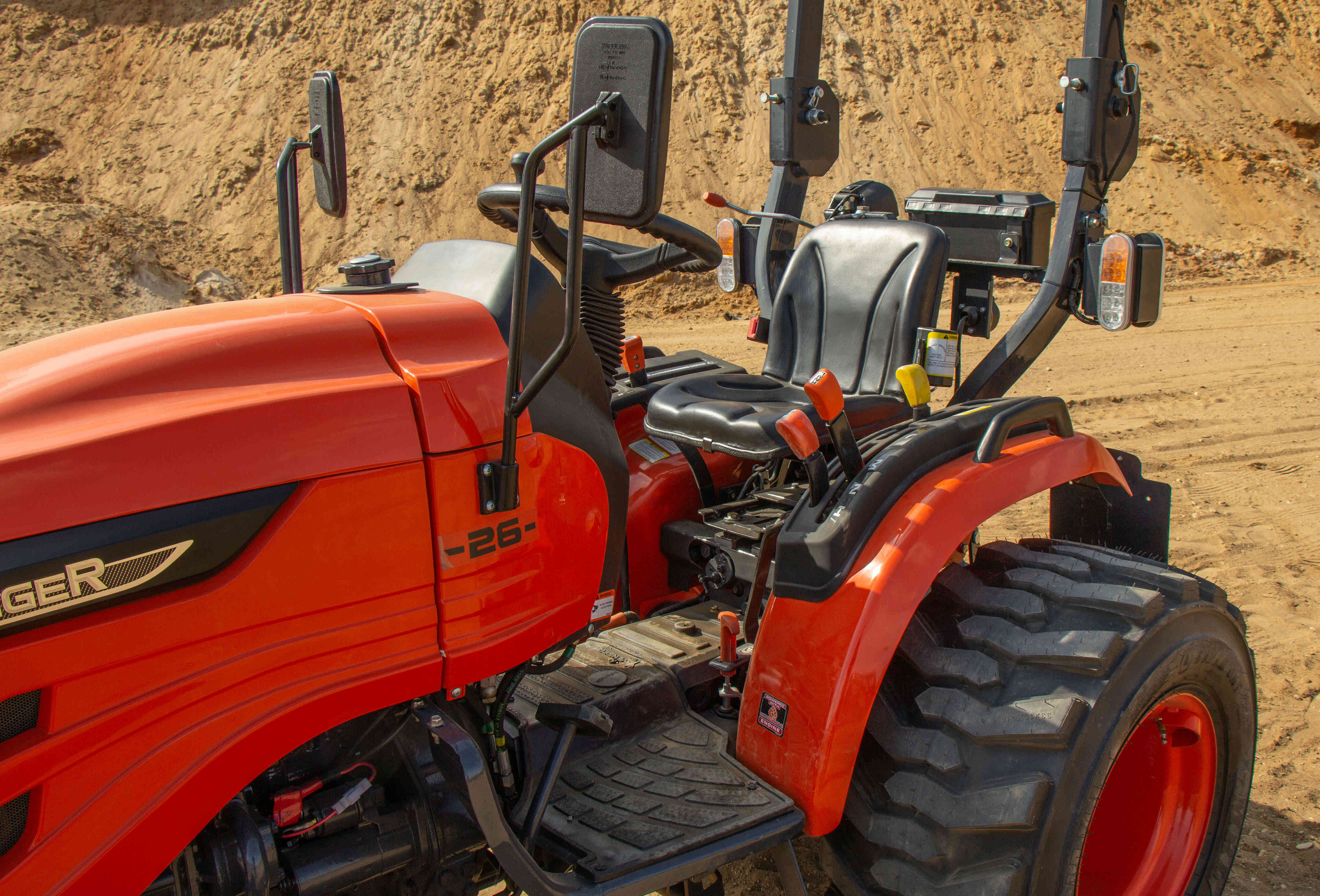 Nepřehlédnutelnou součástí traktoru je ochranný rám ROPS, který má za úkol Vás ochránit v případě převrácení. Výbava tohoto traktoru zahrnuje digitální displej s ukazatelem otáček motoru, motohodinami a informativními kontrolkami, které například ukazují teplotu chladící kapaliny a stav ruční brzdy nebo hladinu paliva v nádrži. Dalšími prvky výbavy jsou odpojovač baterie, 7-pólová zásuvka pro vozík, kastlík na nářadí, ruční i nožní plyn, zadní pracovní světlo a zásuvka na 12V.